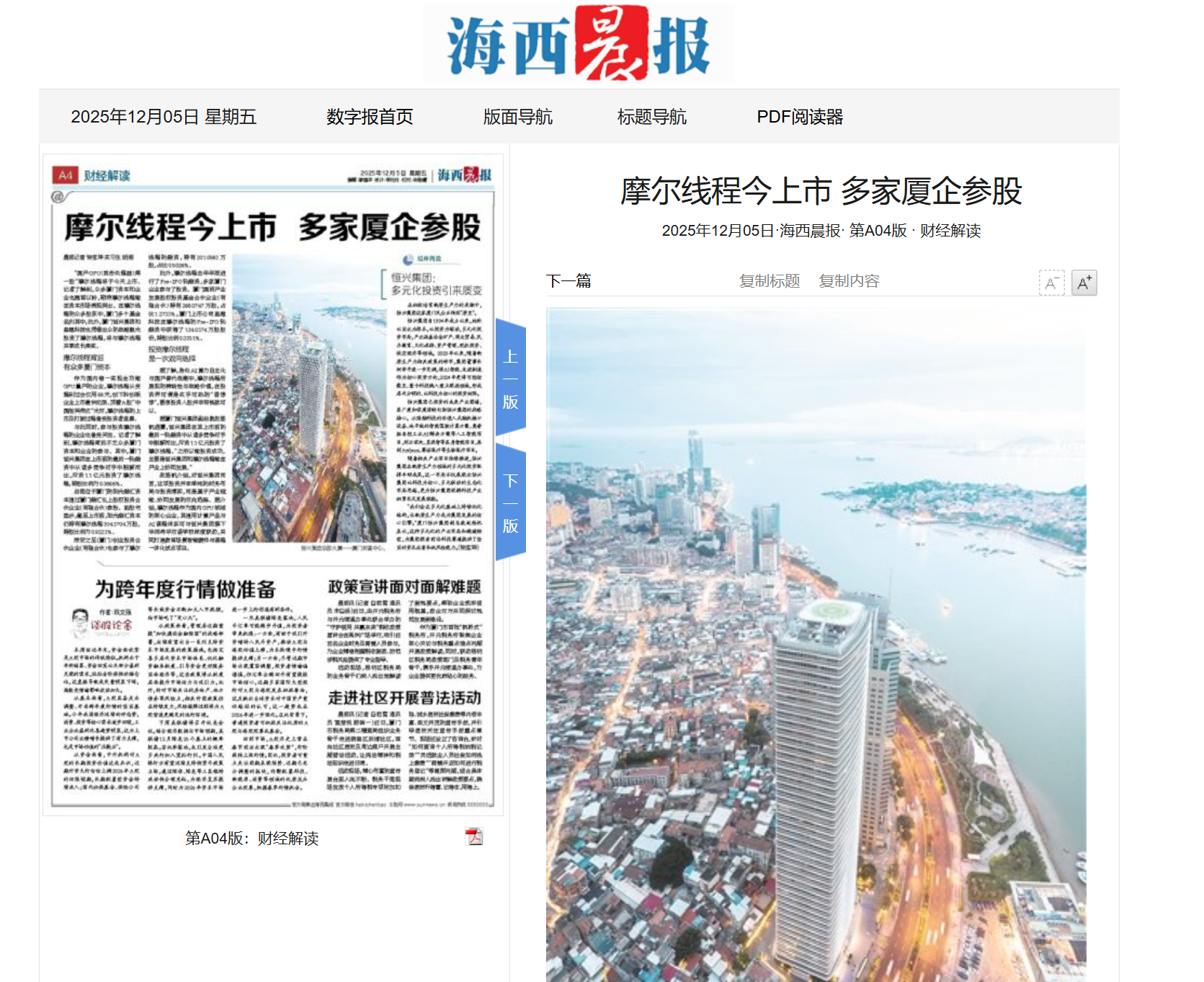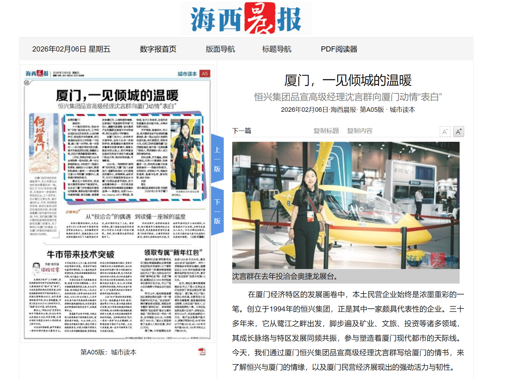 【人民政協(xié)報】2025年12月12日,人民政協(xié)報專訪柯希平文章《踩在時代的“鼓點”上》,刊登于第4版“委員風采”欄目,照寧記者手記《致敬民營企業(yè)家,致敬奮斗者》同步刊登??孪F剑旱谑⑹?、十四屆全國政協(xié)委員,廈門市工商聯(lián)主席,廈門恒興集團有限公司董事長。2025年11月27日,柯希平作為董事長帶領低空經(jīng)濟知名品牌奧捷龍,參加2025亞洲通用航空展;12月3日,他以第二大股東身份,出席廈門奧普拓自控科技有限公司股東董事交流會;12月5日,他以投資人身份,出席“國產(chǎn)GPU第一股”摩爾線程的上市敲鐘儀式……在新質生產(chǎn)力賽道加速布局并收獲頗豐的柯希平,在接受記者采訪時樸實地說:“作為農民的兒子,創(chuàng)業(yè)30多年來,我走對的每一步,都是因為緊跟了國家經(jīng)濟命脈的跳動?!睆募缣艮r產(chǎn)品“趕集”,到如今的商業(yè)版圖涵蓋冶金礦產(chǎn)、商業(yè)貿易、民辦教育、文化旅游、資產(chǎn)管理、股權投資等多個領域,柯希平的經(jīng)歷正是改革開