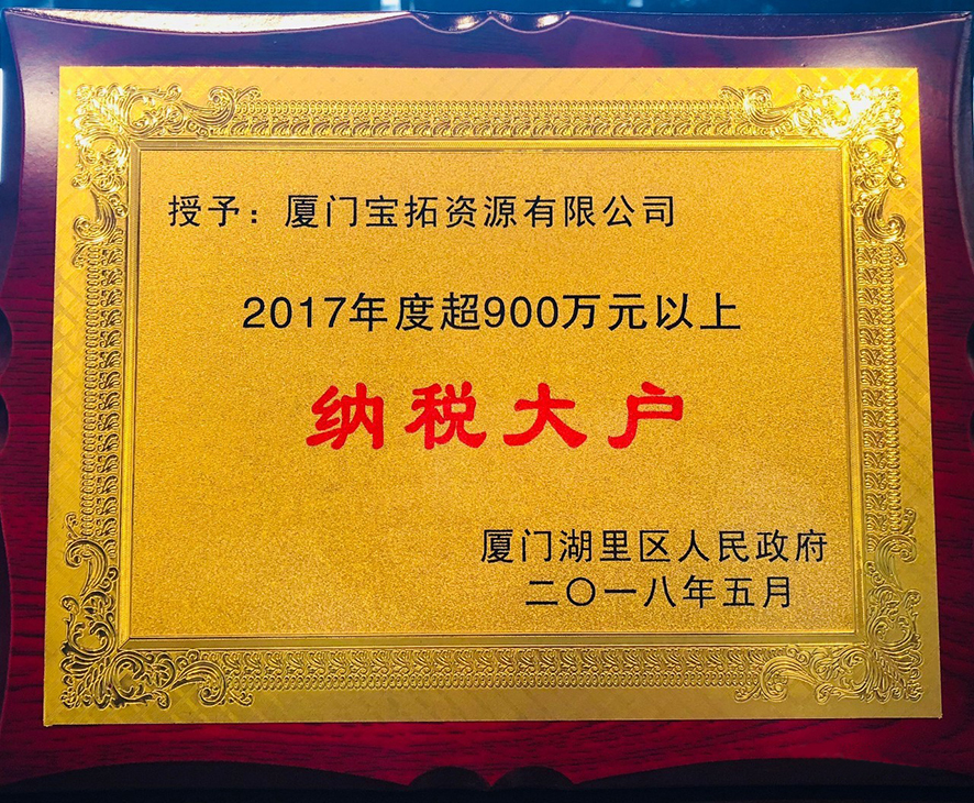 近日,廈門寶拓資源有限公司被廈門市湖里區(qū)政府授予“2017年度超900萬(wàn)元以上納稅大戶”的榮譽(yù)證書(shū)。