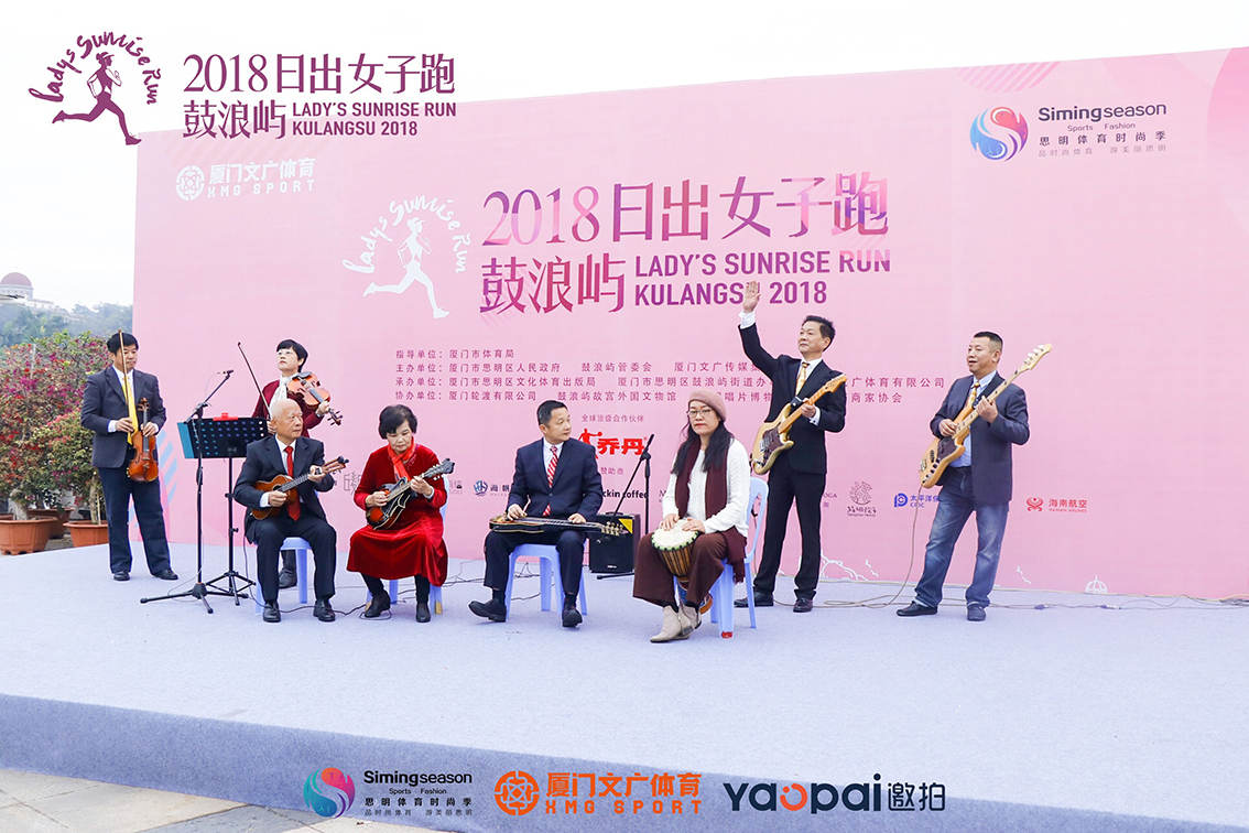 清晨六點(diǎn)的鼓浪嶼,平日里安靜的鋼琴碼頭,此刻已是人群湍動(dòng),白色、粉色相間的日出跑者,在黑夜里閃閃發(fā)光。迎著破曉的曙光,愛樂樂團(tuán)老師們優(yōu)雅的琴聲從耳邊拂過,慢慢變換著節(jié)奏,一曲《鼓浪嶼之波》拉開了日出女子跑的序幕。