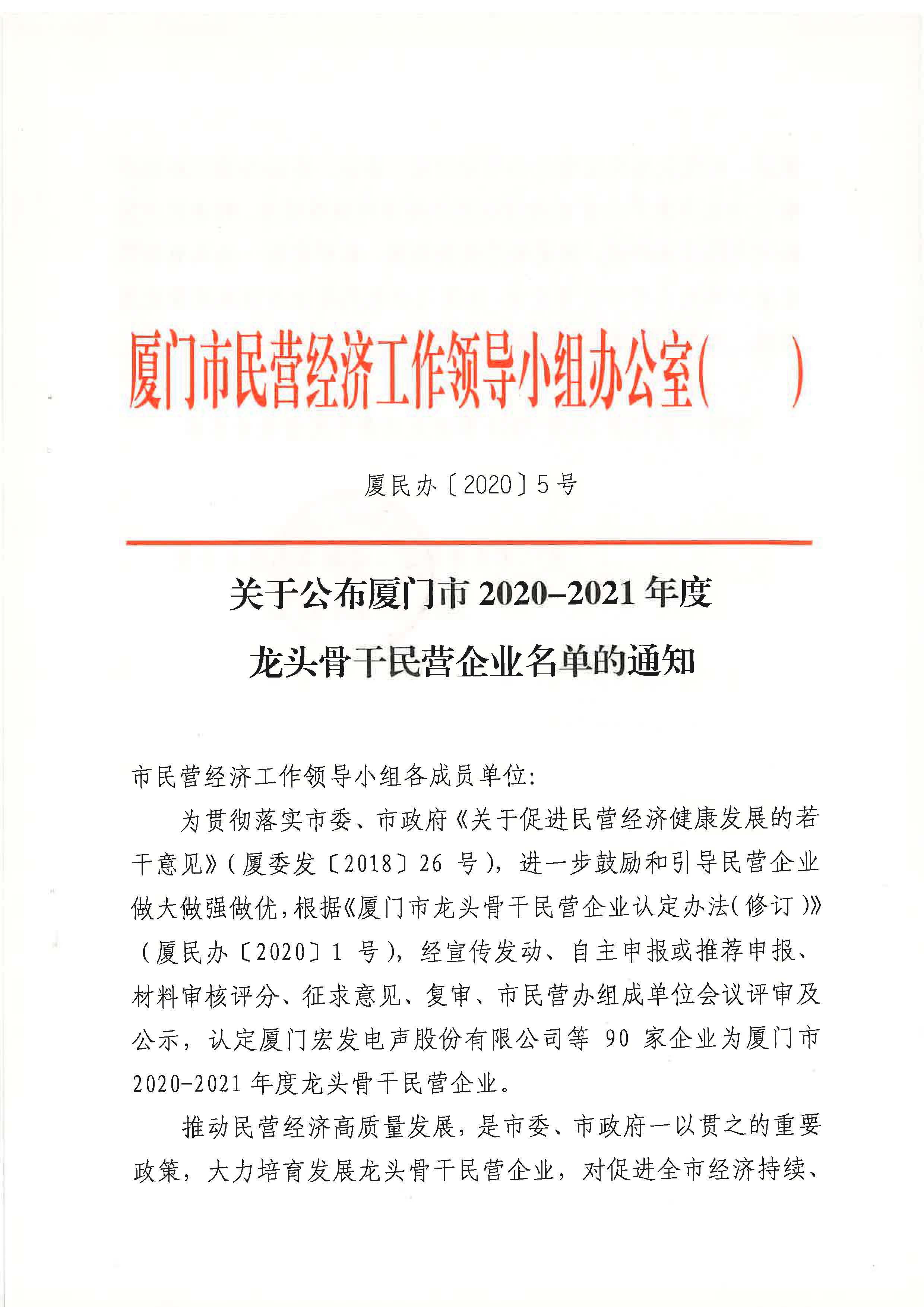 ? ? 為貫徹落實(shí)市委、市政府《關(guān)于促進(jìn)民營(yíng)經(jīng)濟(jì)健康發(fā)展的若干意見(jiàn)》(廈委發(fā)[2018]26號(hào)),進(jìn)一步鼓勵(lì)和引導(dǎo)民營(yíng)企業(yè)做大做強(qiáng)做優(yōu),根據(jù)《廈門市龍頭骨干民營(yíng)企業(yè)認(rèn)定辦法(修訂)》(廈民辦[2020]1號(hào)),經(jīng)宣傳發(fā)動(dòng)、自主申報(bào)或推薦申報(bào)、材料審核評(píng)分、征求意見(jiàn)、復(fù)審、市民營(yíng)辦組成單位會(huì)議評(píng)審及公示,認(rèn)定廈門宏發(fā)電聲股份有限公司等90家企業(yè)為廈門市2020-2021年度龍頭骨干民營(yíng)企業(yè)。