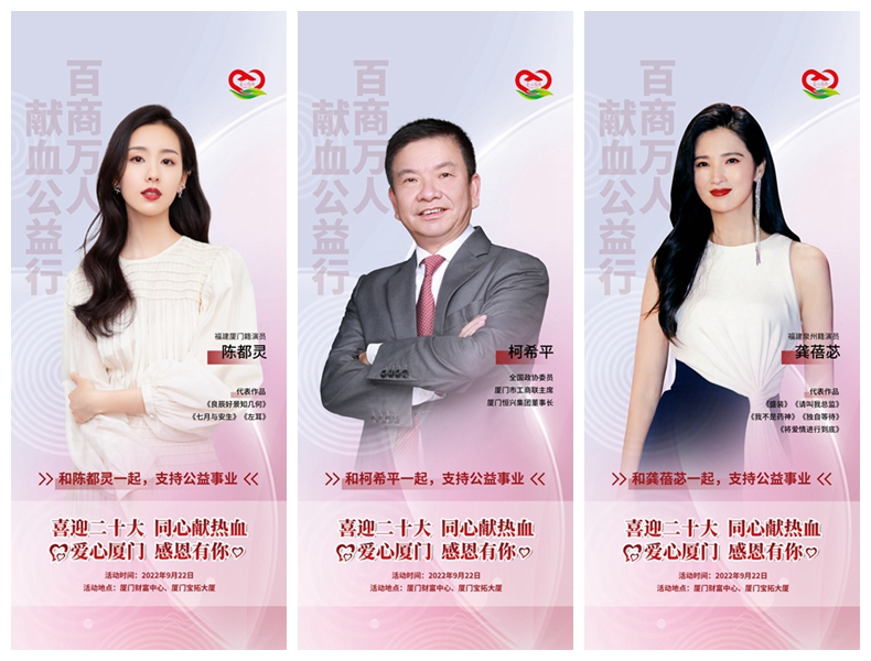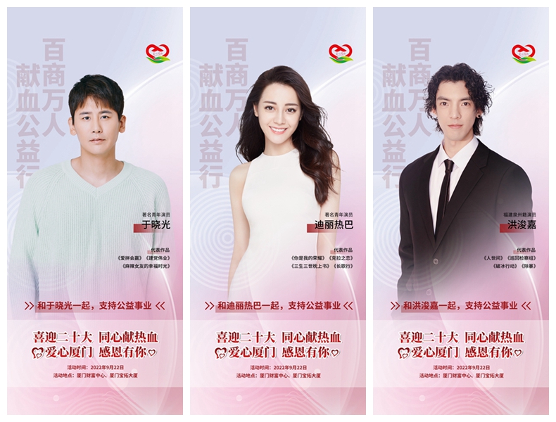 【廈門晚報】9月22日,由市工商聯(lián)(總商會)發(fā)起,并聯(lián)合廈門市中心血站、廈門恒興集團(tuán)主辦的“百商萬人獻(xiàn)血公益行”活動,將在廈門財富中心和寶拓大廈同時舉辦。近日,迪麗熱巴、陳都靈、龔蓓苾、洪浚嘉、于曉光等影視演員紛紛為廈門這一公益活動發(fā)聲,拍攝視頻送上祝福,傳遞“愛心廈門 感恩有你”的正能量,號召愛心志愿者們助力廈門無償獻(xiàn)血公益事業(yè)。