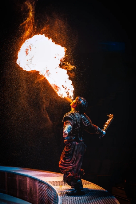“本次升級,我們采用“天幕地屏+激光投影”的立體舞臺設(shè)計(jì),打破了傳統(tǒng)演出的空間限制,給觀眾帶來前所未有的沉浸式體驗(yàn)。”導(dǎo)演閔銳接受采訪時(shí)說,“《王的戰(zhàn)車》以北方部落的古老傳說為藍(lán)本,將傳統(tǒng)技藝與現(xiàn)代科技巧妙融合。比如縵吊演員的表演象征著部落信仰的升華,而噴火表演則象征著勇士的熾熱斗志。整場演出既保留了傳統(tǒng)雜技的力量與驚險(xiǎn),又通過全息投影技術(shù)等科技手段賦予其全新的藝術(shù)表達(dá),希望觀眾在觀演的過程中,除了感受到震撼,也能體會(huì)到中國傳統(tǒng)文化的深厚底蘊(yùn)與傳承。